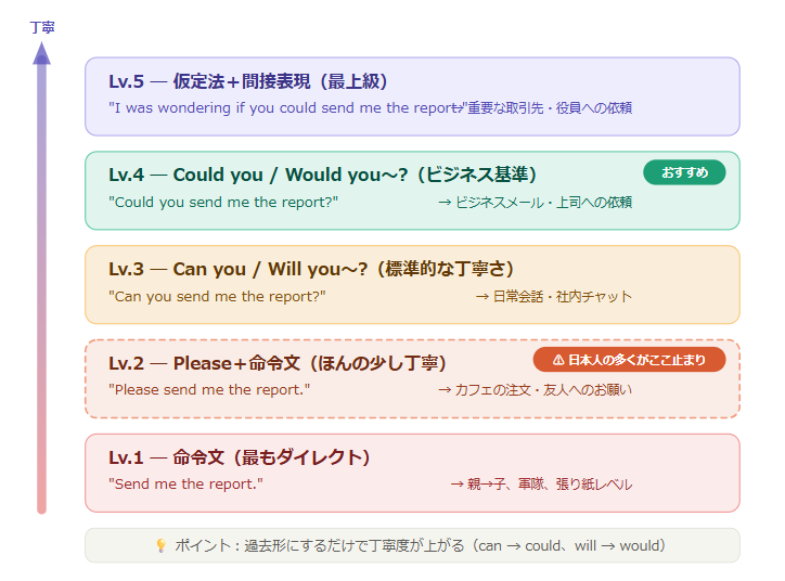 - 英語の丁寧さは5段階:命令文→Please→Can you→Could you→仮定法の順に丁寧度が上がる